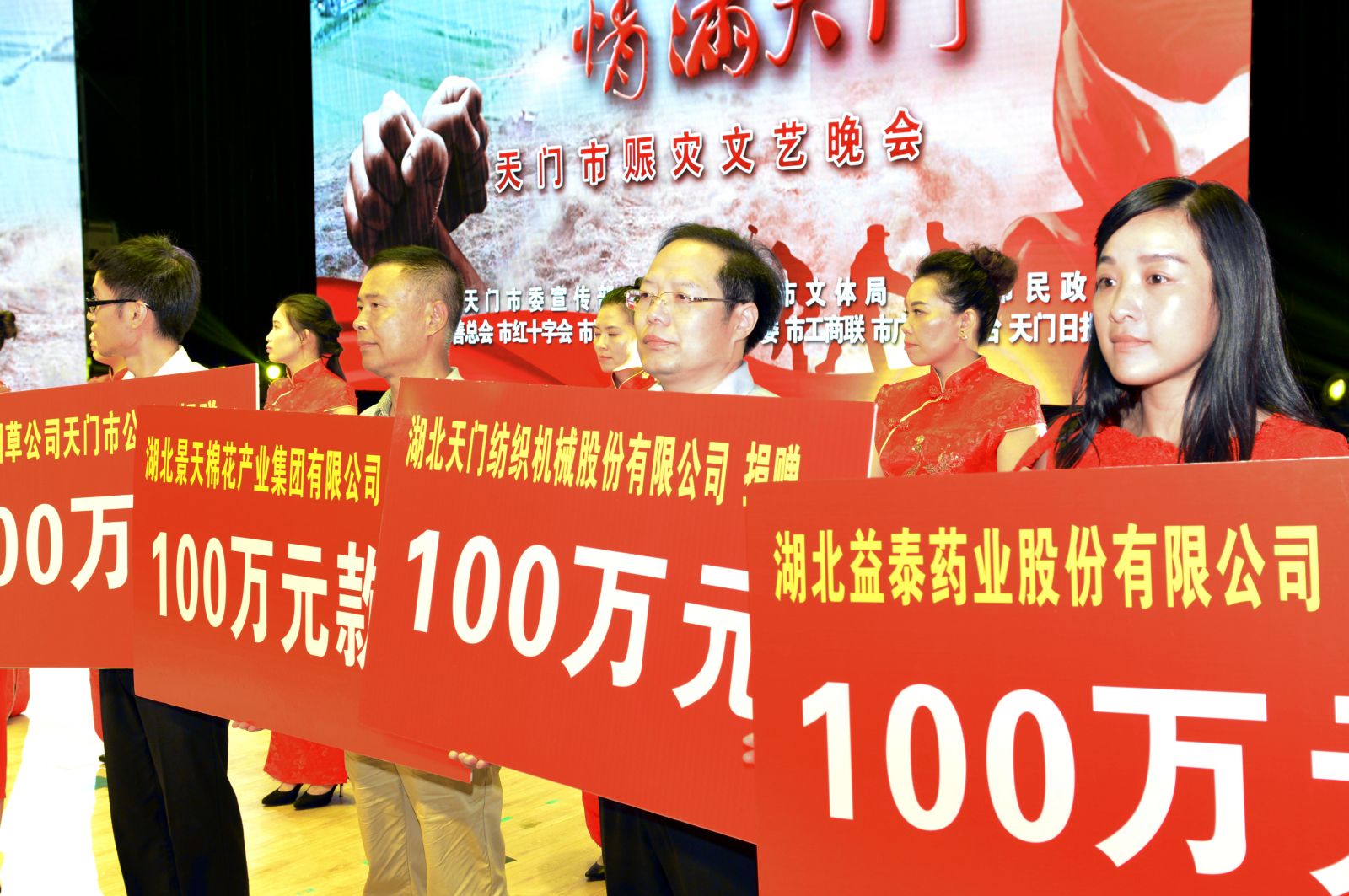 2016年9月2日晚,涼風(fēng)習(xí)習(xí),星光燦爛。由天門市委市政府主辦的主題為"風(fēng)雨共舟,情滿天門"的賑災(zāi)義演晚會拉開序幕。湖北天門紡織機(jī)械股份有限公司心系今夏受百年洪澇災(zāi)害的天門袍澤,慷慨伸出援助之手,繼前三次捐款捐物后,在義演會上再次捐贈100萬元人民幣。