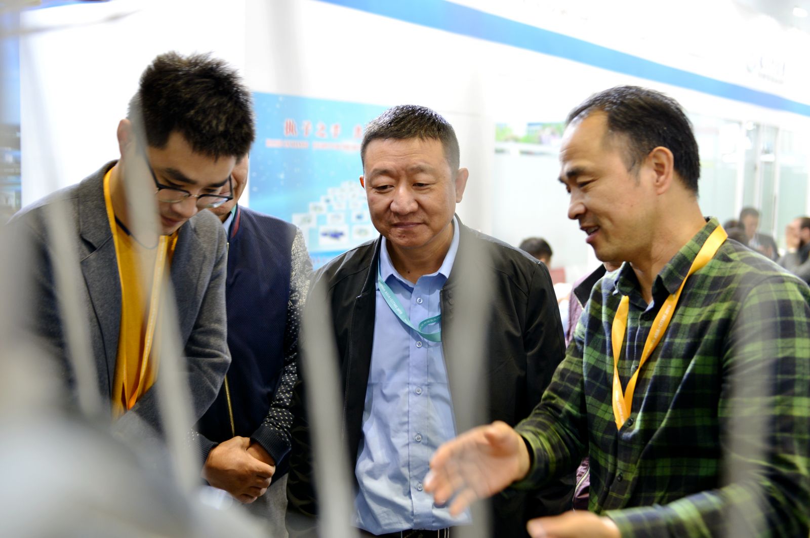 公司董事長沈方勇向中紡聯(lián)原會長杜鈺洲(右3)、中國紡織機械協(xié)會會長王樹田(右2)介紹參展新產(chǎn)品特點
