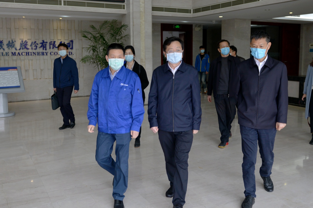 4月21日,湖北省人大常委會黨組成員、人大常委會副主任胡志強一行,在天門市委書記莊光明等領(lǐng)導(dǎo)的陪同下,到天門紡機調(diào)研指導(dǎo),實地了解企業(yè)防疫和復(fù)工復(fù)產(chǎn)情況。