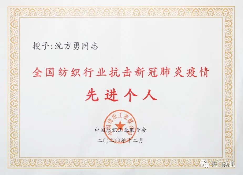 國(guó)家衛(wèi)建委、湖北省、天門市共11次檢查指導(dǎo)防疫工作,給予高度好評(píng)。國(guó)家衛(wèi)健委副主任于學(xué)軍評(píng)價(jià)天門紡機(jī)防疫有預(yù)案、有演練、有實(shí)踐,對(duì)企業(yè)抓防疫、保復(fù)產(chǎn)、促就業(yè)給予了充分肯定。9月,董事長(zhǎng)獲評(píng)“全國(guó)紡織行業(yè)抗擊新冠肺炎疫情先進(jìn)個(gè)人”、天門市“抗擊新冠肺炎疫情先進(jìn)個(gè)人”,代表公司在疫情的大考中獲得時(shí)代新榮譽(yù)。