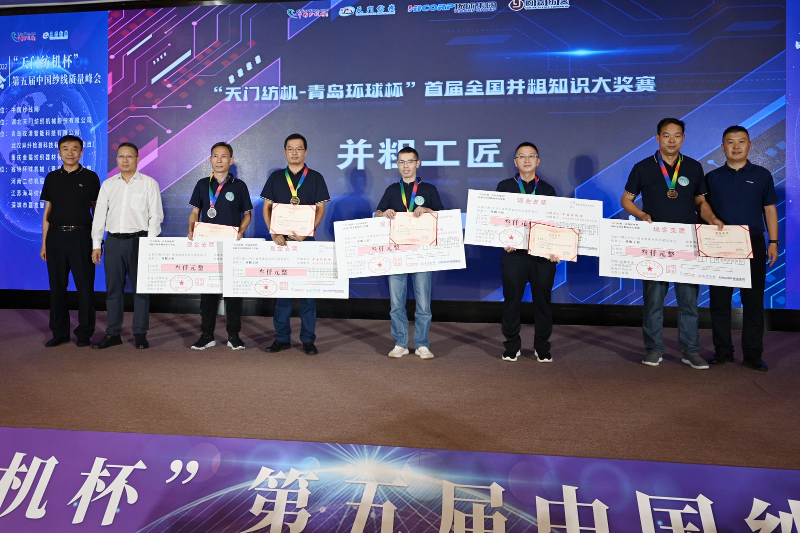 這是一場別開生面的競賽學(xué)習(xí)活動,6位選手的精彩表現(xiàn)不斷地贏得熱烈的掌聲,江蘇悅達(dá)馮傳軍以888分獲得“天門紡機(jī)-青島環(huán)球杯”首屆全國并粗知識大獎賽-爭霸賽冠軍,為歷時3個月的大賽活動劃上圓滿的句號。現(xiàn)場爭霸賽結(jié)束后,隆重舉行了頒獎活動,現(xiàn)場頒發(fā)“企業(yè)優(yōu)秀組織獎”、“并粗工匠獎”、“并粗大工匠獎”。天門紡機(jī)副總經(jīng)理肖少華、賽特環(huán)球營銷總監(jiān)陳濤、中國紗線網(wǎng)總裁鞠彥軍為大賽活動致辭并頒獎。