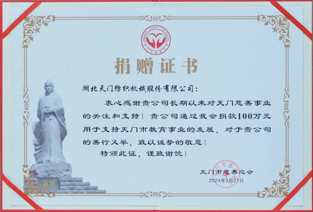 2024年3月21日,天門紡機董事長沈方勇出席在天門市盧市鎮(zhèn)盧家口中學舉行的天門慈善總會“紅燭教育基金”成立暨首捐儀式,同天門市慈善總會、教育局三方簽訂了《天門市慈善總會“紅燭教育基金”協(xié)議書》,并現(xiàn)場捐贈100萬元,用于獎勵盧市鎮(zhèn)優(yōu)秀教師和幫扶困難教師等公益活動,助力盧市鎮(zhèn)教育高質量發(fā)展。天門市人民政府副市長古玉麗,天門市民政局局長、市慈善總會會長謝金才,天門市教育局局長劉華陽,天門市慈善總會秘書長李貴清,盧市鎮(zhèn)宣傳統(tǒng)戰(zhàn)委員劉恒超以及盧市鎮(zhèn)部分教師代表等參加首捐儀式。盧市鎮(zhèn)黨委書記趙君波主持儀式。