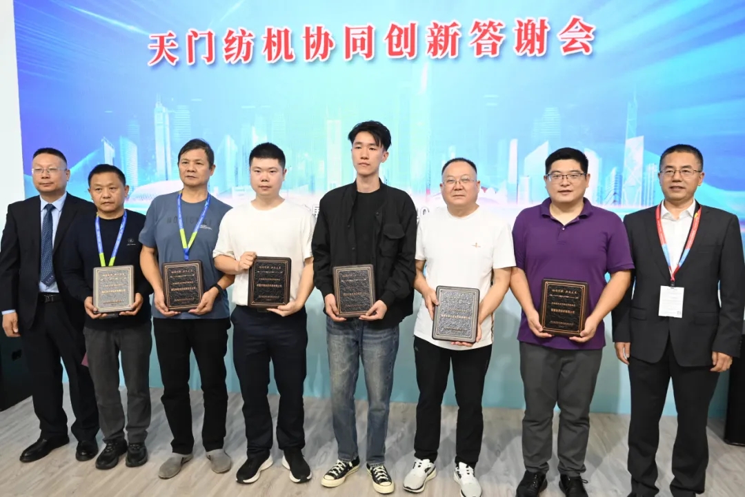天門(mén)紡機(jī)總經(jīng)理焦倫進(jìn)宣布在協(xié)同創(chuàng)新中作出突出貢獻(xiàn)的單位和個(gè)人名單,中國(guó)紡織工業(yè)聯(lián)合會(huì)徐迎新副會(huì)長(zhǎng)為倪俊龍董事長(zhǎng)、陳冰教授、曹中華博士、陸惠文先生頒發(fā)紀(jì)念章,為臺(tái)達(dá)、匯川、南通五洲等3家企業(yè)代表頒發(fā)紀(jì)念牌。