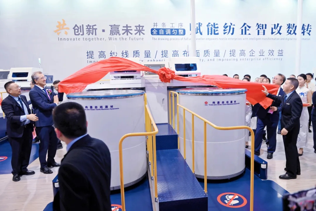 答謝會(huì)結(jié)束后,隨即舉行了新產(chǎn)品揭幕、開(kāi)機(jī)儀式。天門(mén)紡機(jī)今年展出了TM23、TM27H、TM29H、TM35等四款型號(hào)的并條機(jī)。中國(guó)紡織工業(yè)聯(lián)合會(huì)孫瑞哲會(huì)長(zhǎng)等行業(yè)領(lǐng)導(dǎo)、嘉賓一起為新產(chǎn)品揭幕,孫會(huì)長(zhǎng)為展機(jī)啟動(dòng)開(kāi)機(jī)。