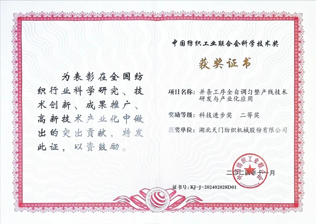 2024年11月12日,在北京人民大會堂召開的2024年度中國紡織工業(yè)聯(lián)合會科學技術(shù)獎勵大會傳來喜訊,由天門紡機主導,武漢紡織大學、安徽華茂紡織股份有限公司、武漢銀橋南海光電有限公司等單位合作開發(fā)的“并條工序全自調(diào)勻整產(chǎn)線技術(shù)研發(fā)與產(chǎn)業(yè)化應用項目”獲得2024年“中國紡織工業(yè)聯(lián)合會科學技術(shù)獎”科技進步二等獎。